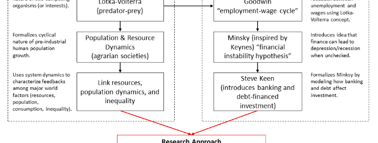 Figure 4. The research approach makes the critical link between biophysical modeling concepts and those of economic models that specifically include the link of debt-based finance to employment and economic growth.